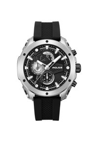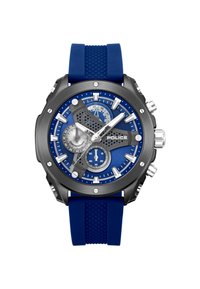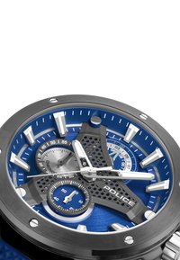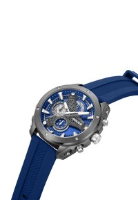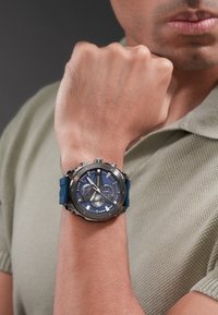 Homme portant une montre-bracelet bleue et argentée avec plusieurs cadrans, poing serré levé près de son visage, vêtu d'un polo léger à texture.