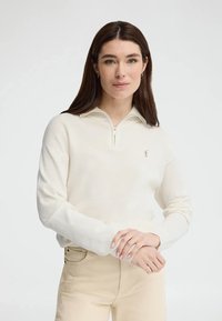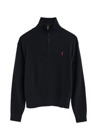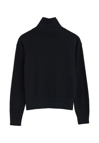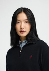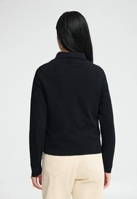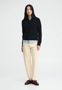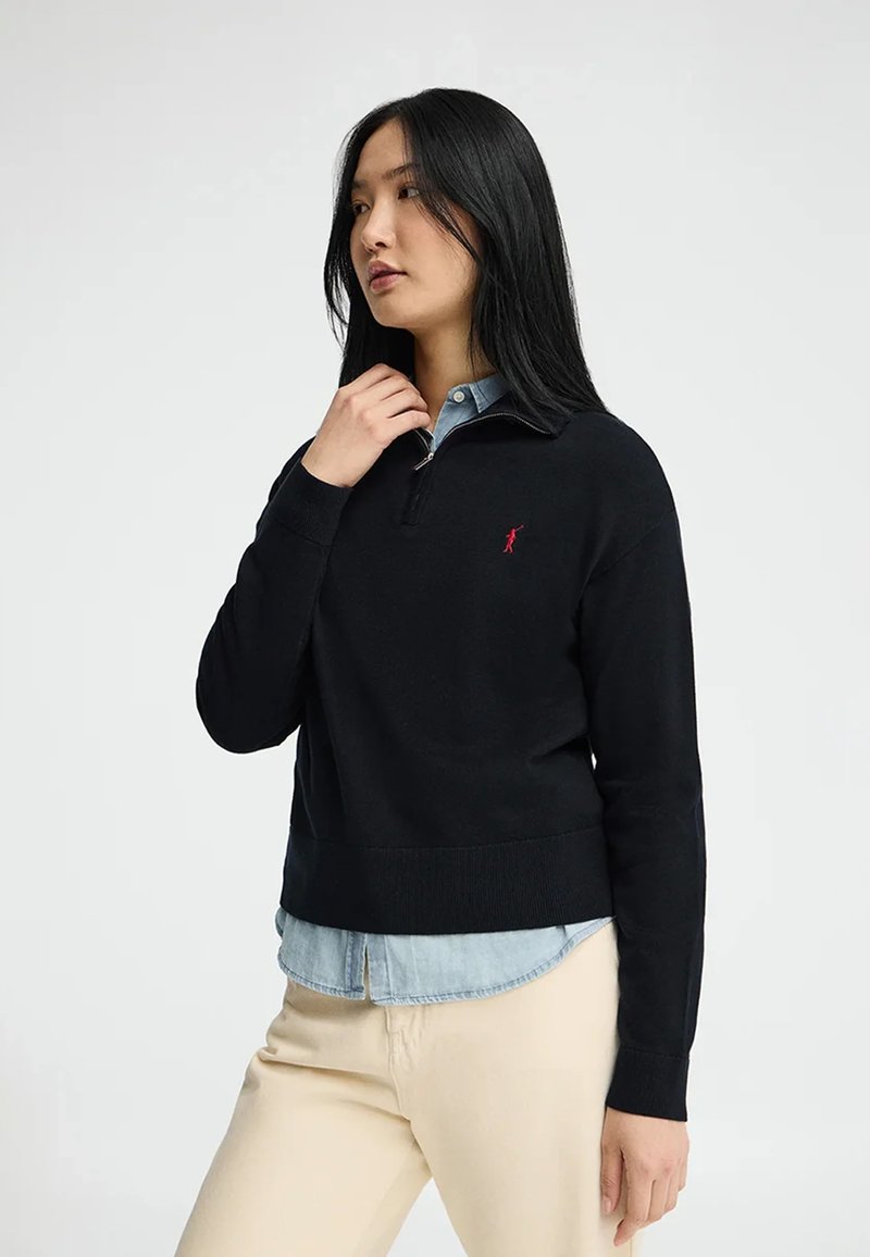 Femme aux longs cheveux noirs portant un pull noir à fermeture éclair sur une chemise en jean et un pantalon beige, debout devant un fond clair uni.