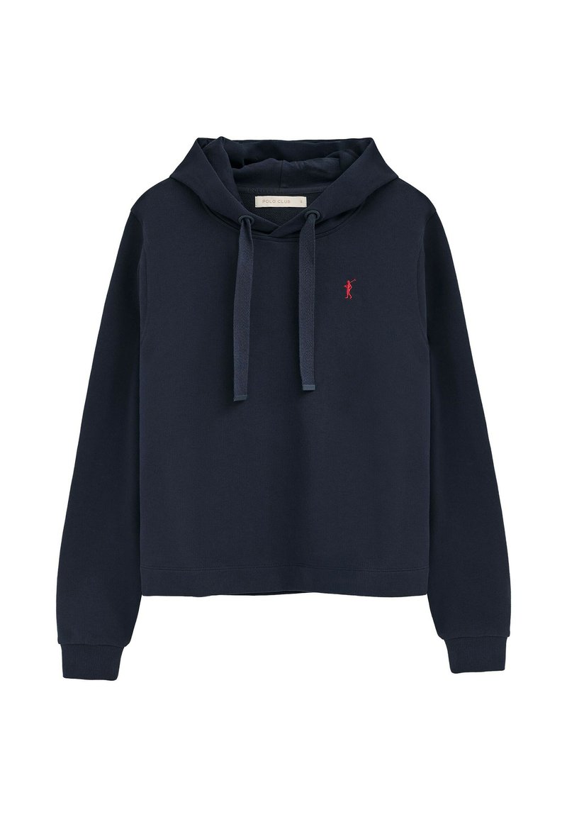 Hoodie bleu marine à manches longues, cordons de serrage à l'avant, poignets côtelés, petit logo brodé rouge représentant un joueur de polo sur la poitrine.