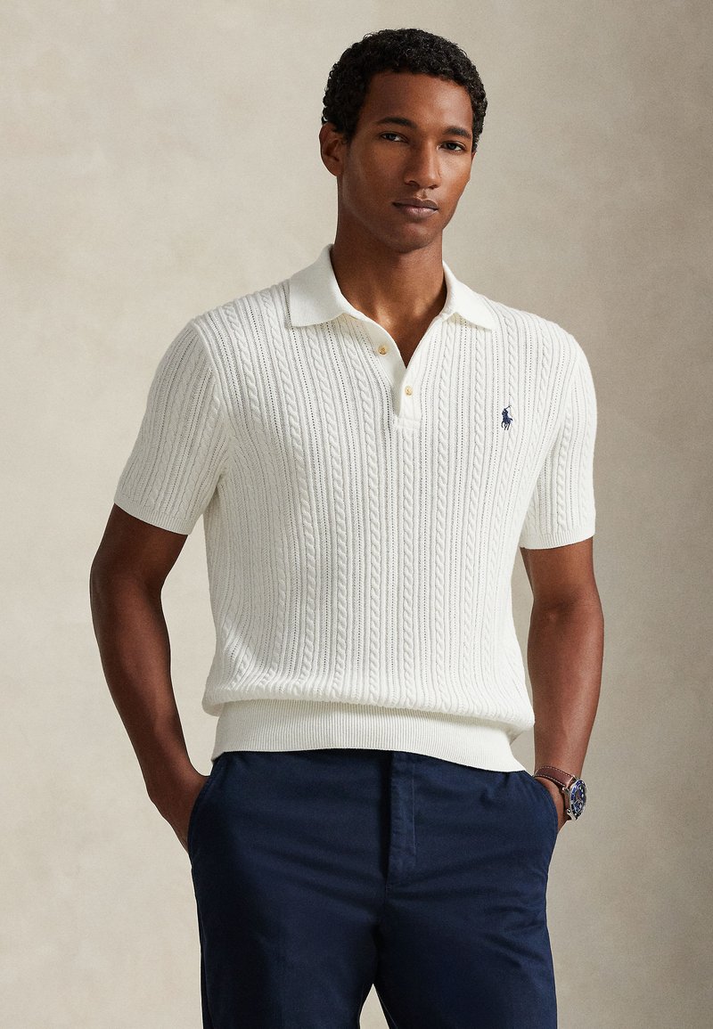 CABLE-KNIT COTTON POLO-COLLAR SWEATER - Polo - deckwash white w/ navy pp