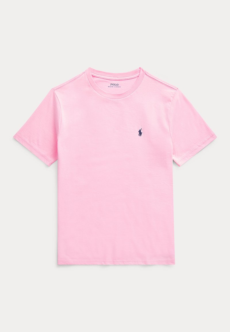 T-shirt rose clair à manches courtes et col rond avec petit logo bleu marine Polo Ralph Lauren brodé sur la poitrine gauche.