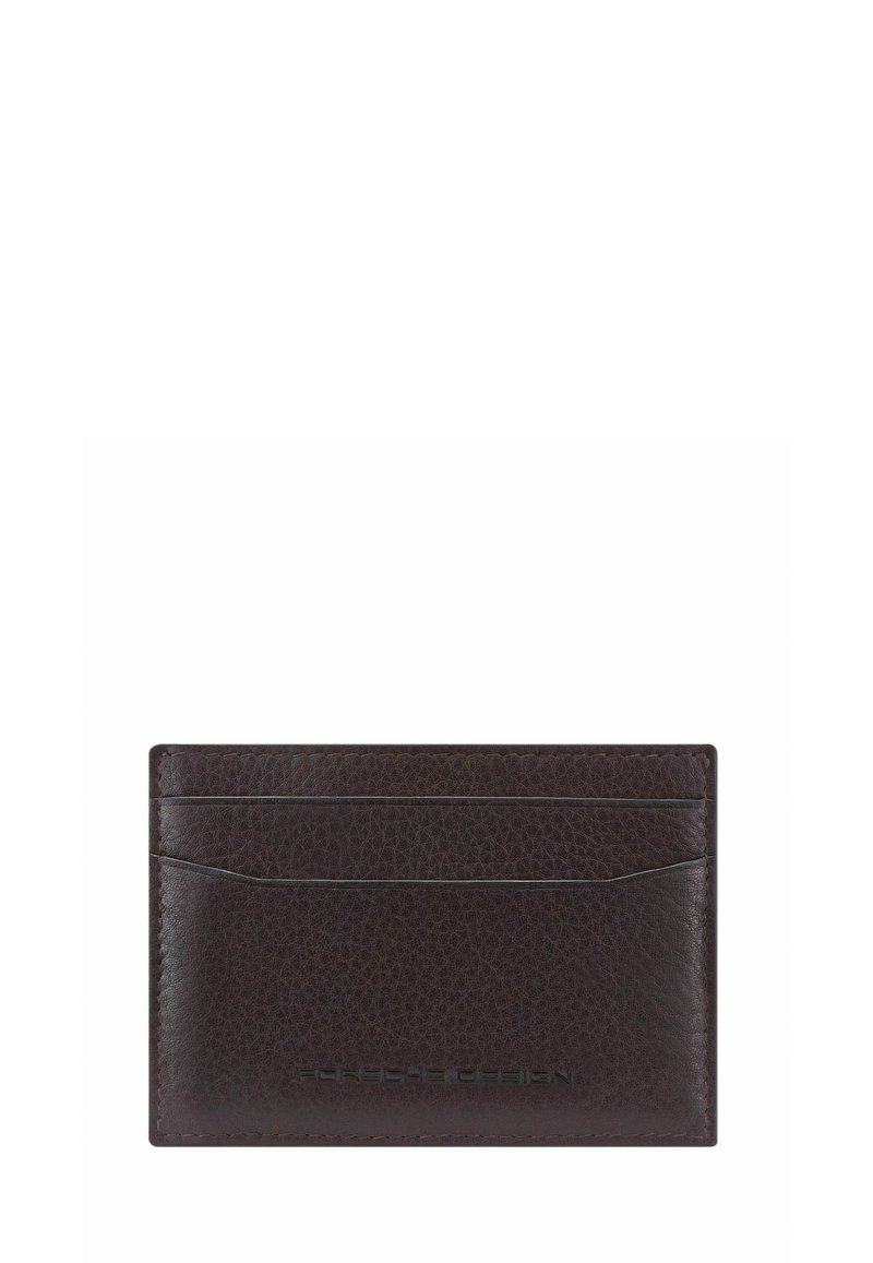 Porte-cartes en cuir marron foncé avec surface texturée, trois emplacements pour cartes et logo embossé "Porsche Design" en bas au centre.