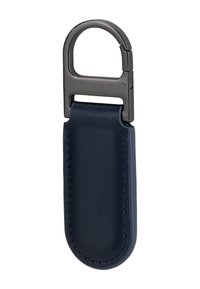 Porte-clés avec bracelet en cuir bleu marine embossé "Porsche Design" et fermoir en métal gravé "Porsche Design", accompagné d’un petit anneau en métal.