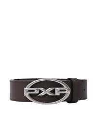 Ceinture en cuir noir avec une grande boucle ovale argentée arborant les lettres "PXP" en relief, roulée avec une couture visible le long des bords.
