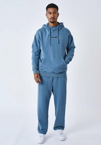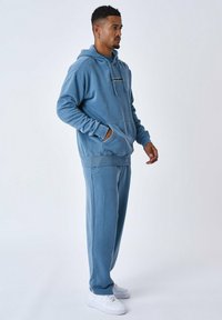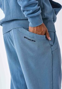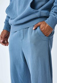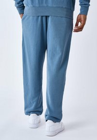 Pantalon de survêtement en coton bleu avec une coupe décontractée, poches latérales, taille élastique et poignets côtelés, associé à des chaussures de sport blanches.