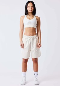 Personne portant un short écru à cordon de serrage avec le logo PXP, des chaussettes blanches de marque, et des baskets blanches, debout avec une main dans la poche.