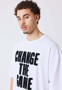 Jeune homme aux cheveux bouclés portant un t-shirt blanc oversize avec un texte noir audacieux « CHANGE THE GAME », regardant vers le bas et sur le côté.