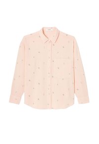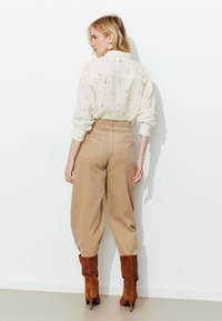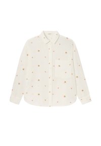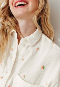 Jeune femme aux longs cheveux blonds portant une chemise blanche à fleurs à boutons et un pantalon en velours côtelé beige, debout sur un fond blanc.