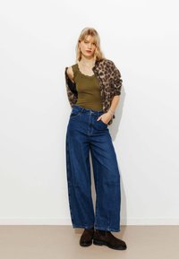 Débardeur vert olive avec bordure en dentelle au niveau du décolleté, associé à un jean large en denim bleu taille haute. Bracelets en argent au poignet.