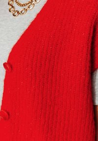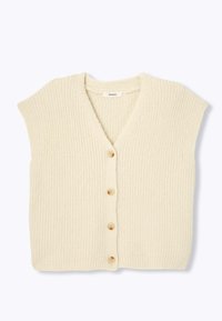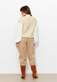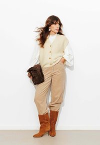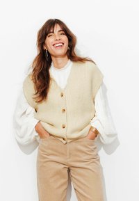Veste beige en tricot avec des boutons en bois, portée sur un chemisier blanc texturé. Associée à un pantalon en velours côtelé couleur tan clair.