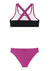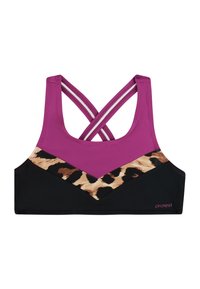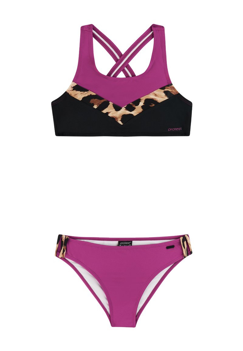 Maillot deux pièces avec motifs violet, noir et léopard ; haut style brassière de sport avec bretelles croisées et bas de bikini assorti.