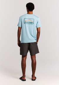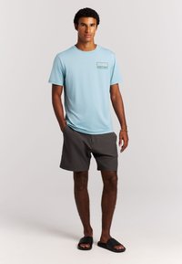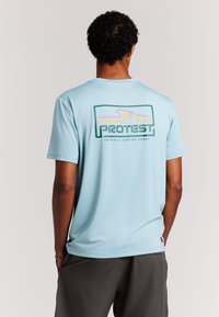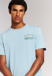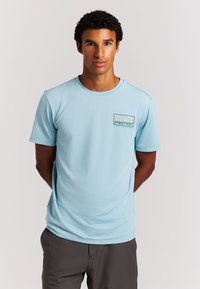 T-shirt bleu clair à manches courtes avec un logo multicolore et du texte au dos. Tissu lisse et coupe décontractée, adaptée pour un usage quotidien.