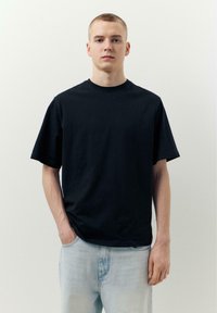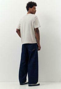 Deux hommes se tiennent côte à côte, portant des t-shirts amples unis et des jeans en denim larges, devant un fond neutre, les mains dans les poches.