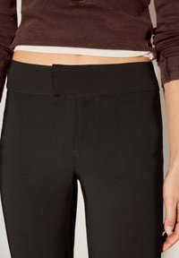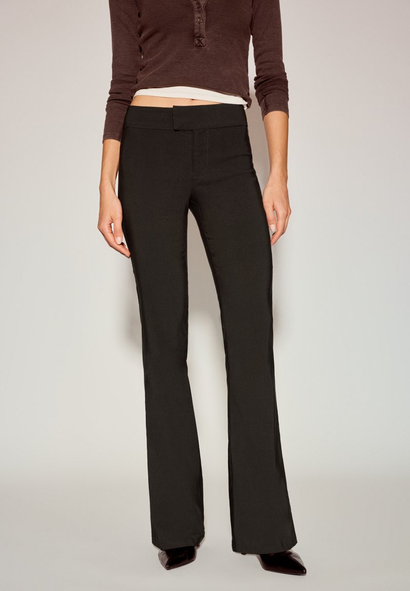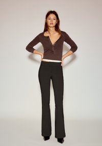 Pantalon noir évasé avec une texture lisse, une ceinture simple et une coupe ajustée au niveau de la cuisse, associé à un haut marron moulant.