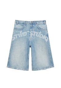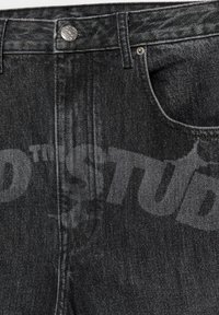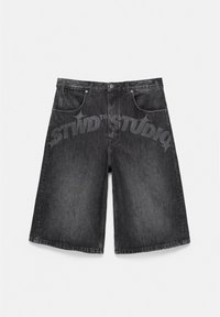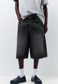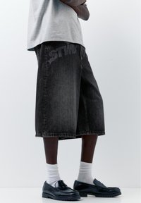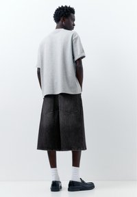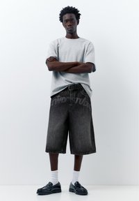 Personne portant un short en jean noir délavé oversize avec une ceinture noire, un t-shirt gris, des chaussettes blanches et des mocassins noirs, les mains dans les poches.