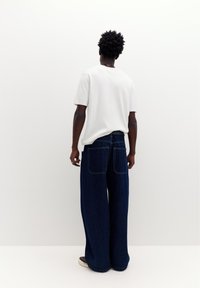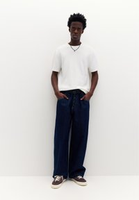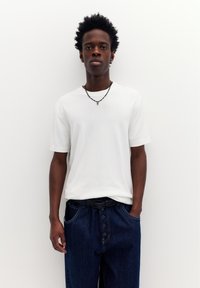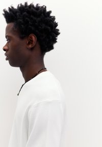 Jeune homme debout devant un fond blanc, portant un t-shirt blanc uni, un jean bleu foncé avec une braguette boutonnée, et un collier noir à perles.