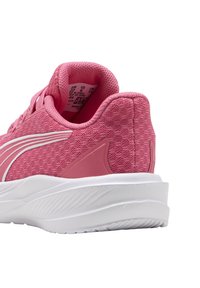 Baskets de sport roses avec semelle en caoutchouc blanche et lacets, tige en mesh respirant et motif de rayure incurvée sur le côté.