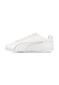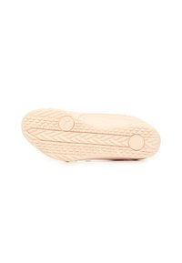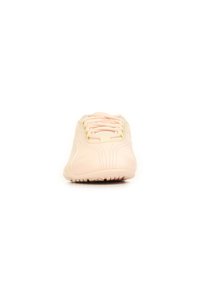 Chaussures de sport rose clair avec une finition en cuir lisse, présentant un design minimaliste, un bout arrondi et des accents subtils, y compris des lacets étroits.