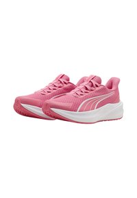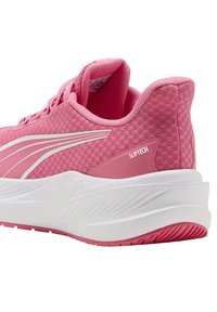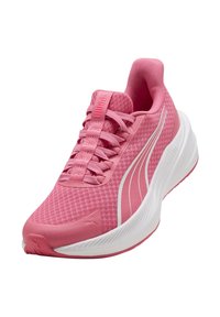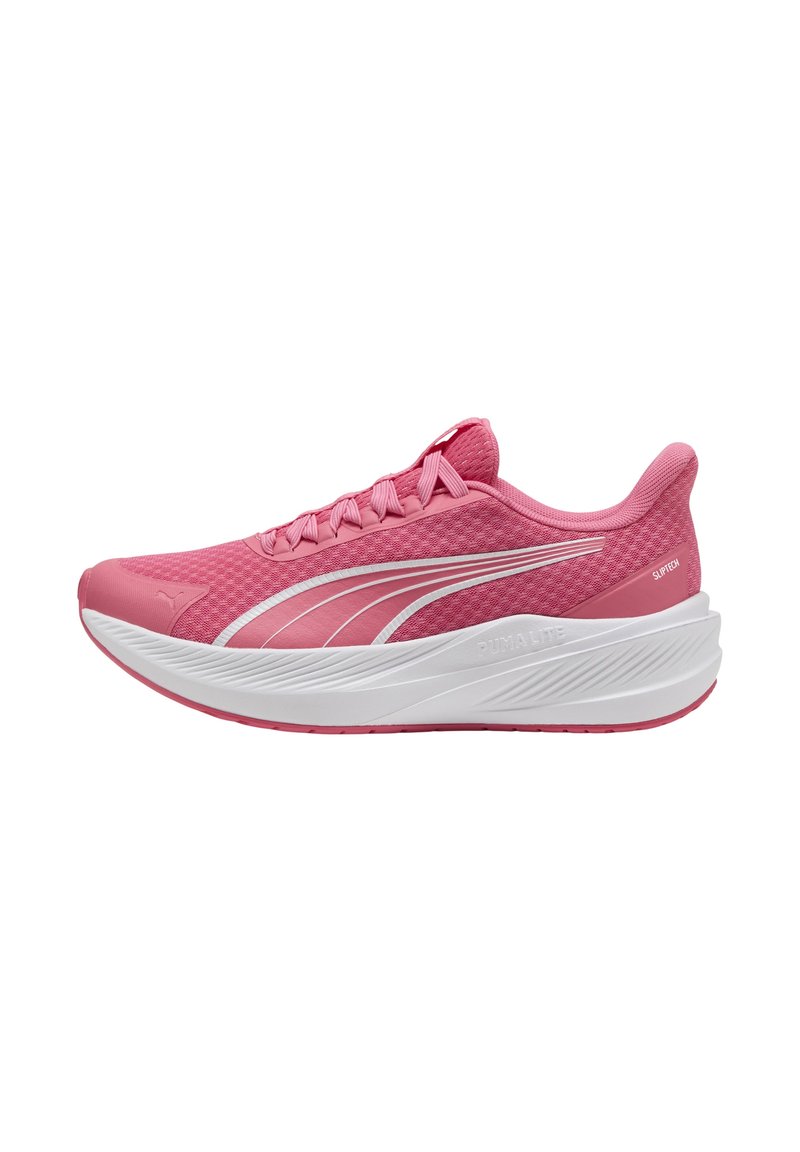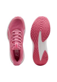 Chaussure de sport rose avec semelle blanche, tige en mesh, lacets et bande logo latérale, vue de côté extérieur.