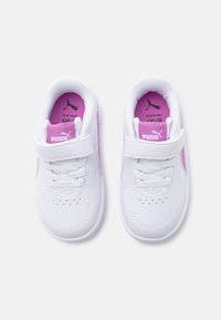 Baskets blanches pour enfants avec une bande rose Puma, une bride à fermeture auto-agrippante et des détails en lacets sur un fond gris clair.