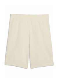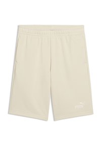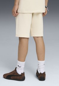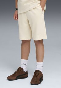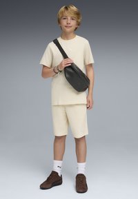 Garçon blond portant un t-shirt crème Puma et un short, tenant un sac bandoulière noir, avec des chaussures Puma marron et des chaussettes blanches sur un fond gris.