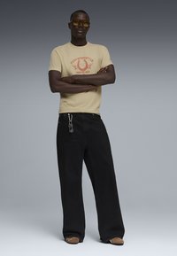 Homme portant un t-shirt beige à motif, un pantalon noir surdimensionné avec des clés accrochées, des chaussures marron et des lunettes de soleil teintées ambre, les bras croisés.