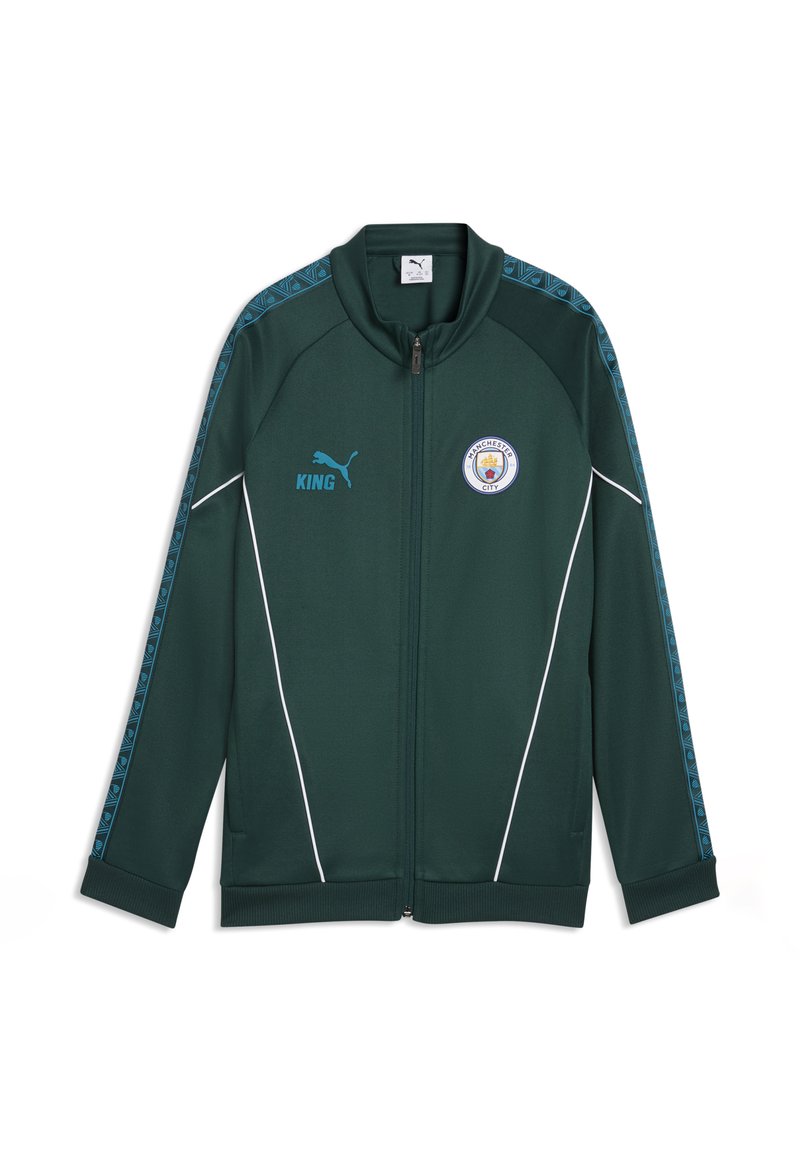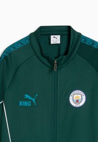 Veste zippée intégrale vert foncé avec logo Puma bleu, texte "KING", emblème de Manchester City et rayures bleues à motifs le long des manches.