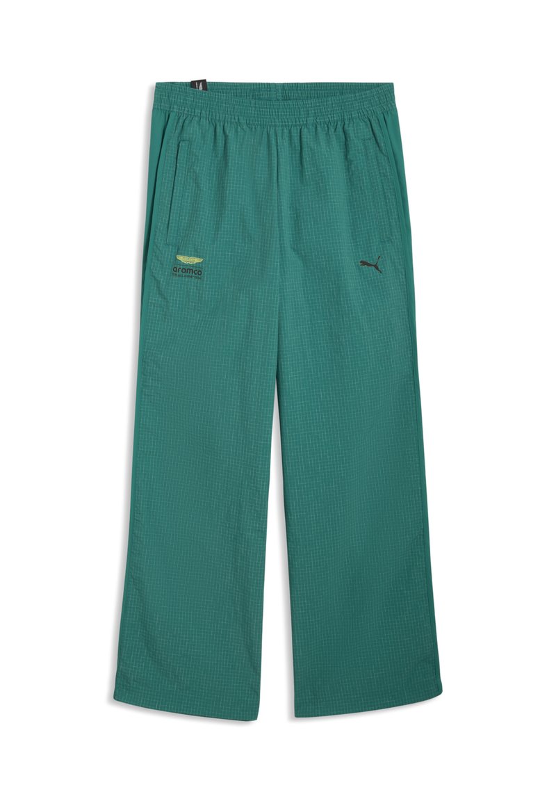 Pantalon fluide couleur sarcelle avec taille élastique, poches latérales, motif en relief à carreaux, logos Aramco et Puma à l'avant.