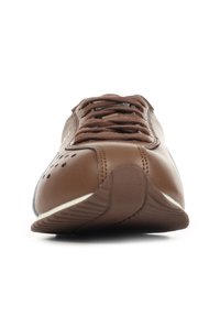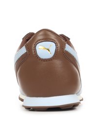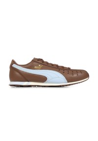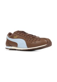 Baskets en cuir marron avec une bande courbe bleu clair et un design à lacets, présentées de profil sur un fond blanc.