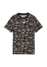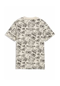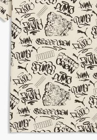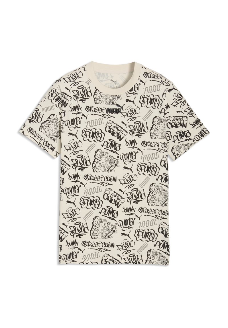 T-shirt à manches courtes crème avec texte en style graffiti noir et croquis, comprenant des logos "Puma" répétés et des motifs d'art de rue.