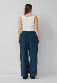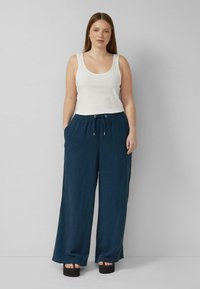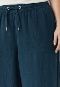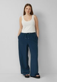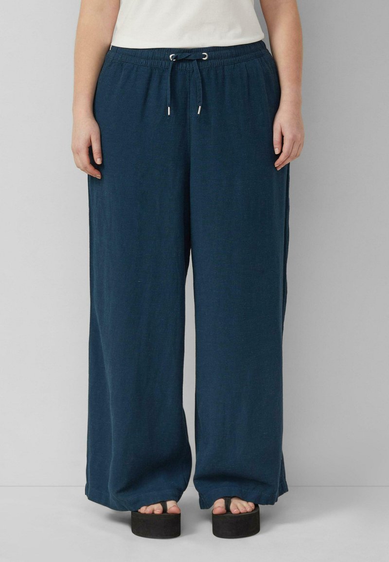Personne portant un pantalon large bleu marine avec taille à cordon et des sandales à plateforme noires, debout contre un mur gris uni.