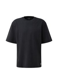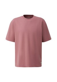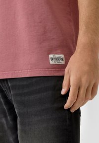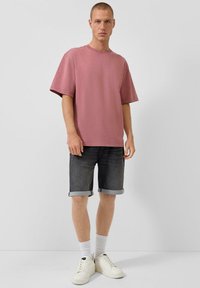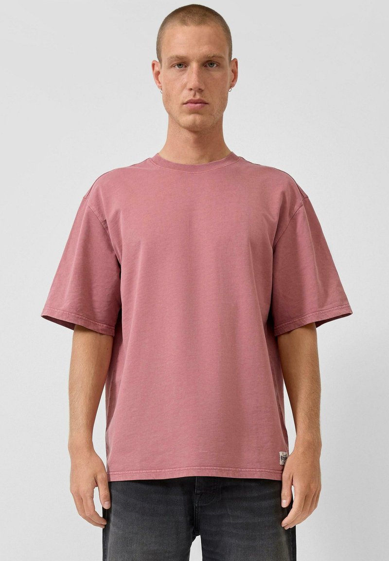 Homme debout, face à l'avant, portant une chemise ample à manches courtes rose poudré et un pantalon noir, sur un fond clair uni.