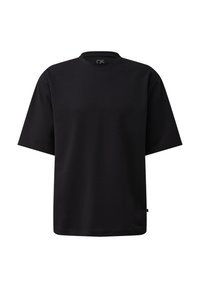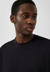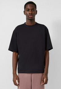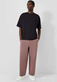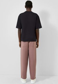 Jeune homme portant une chemise noire unie oversize à manches courtes et un pantalon rose clair sur un fond uni.