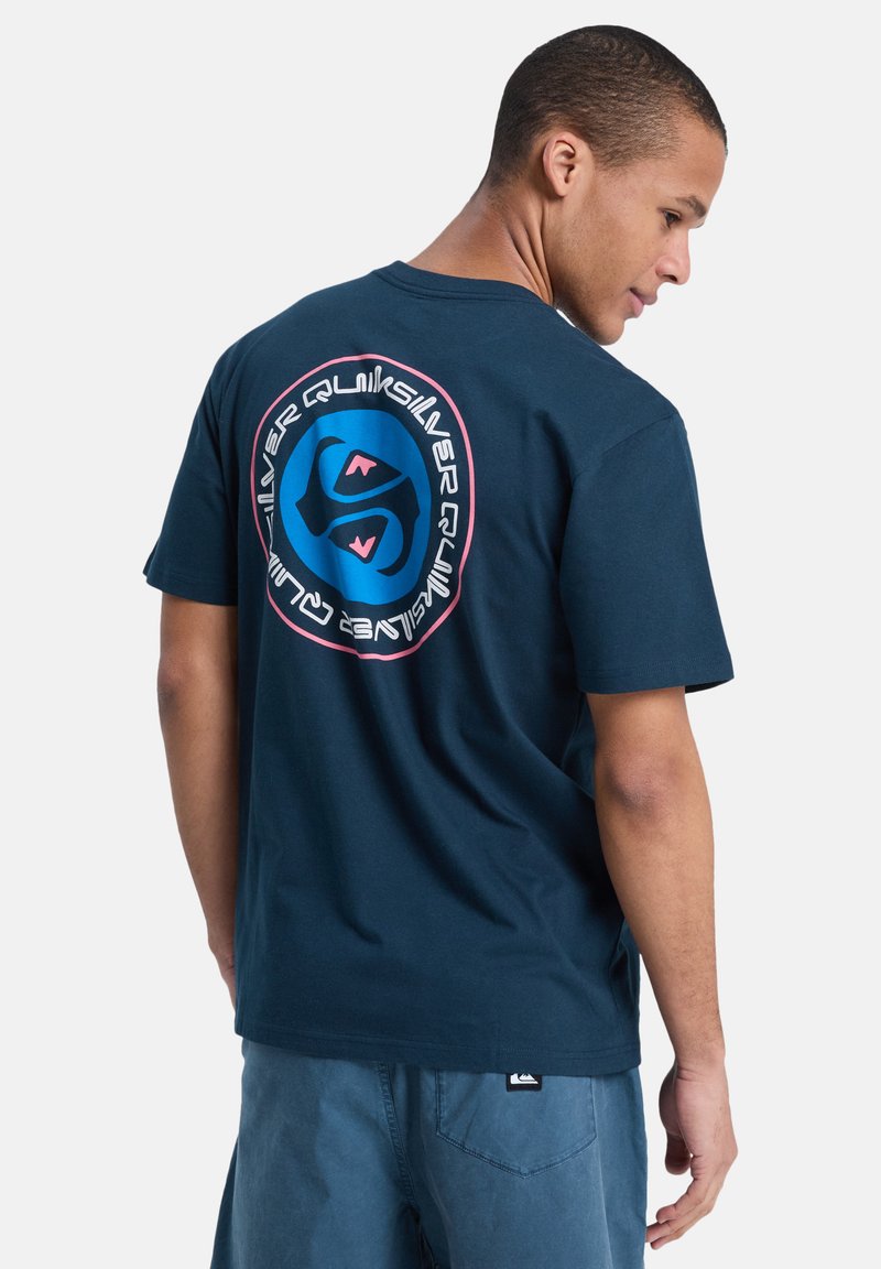 T-shirt en coton bleu marine avec un graphique circulaire au dos agrémenté d'accents multicolores. Manches courtes et coupe décontractée.