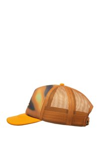 Casquette trucker tie-dye jaune et orange avec dos en maille et visière incurvée, arborant un logo stylisé d'une vague montagne sur le panneau avant.
