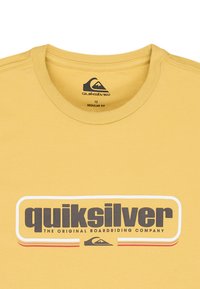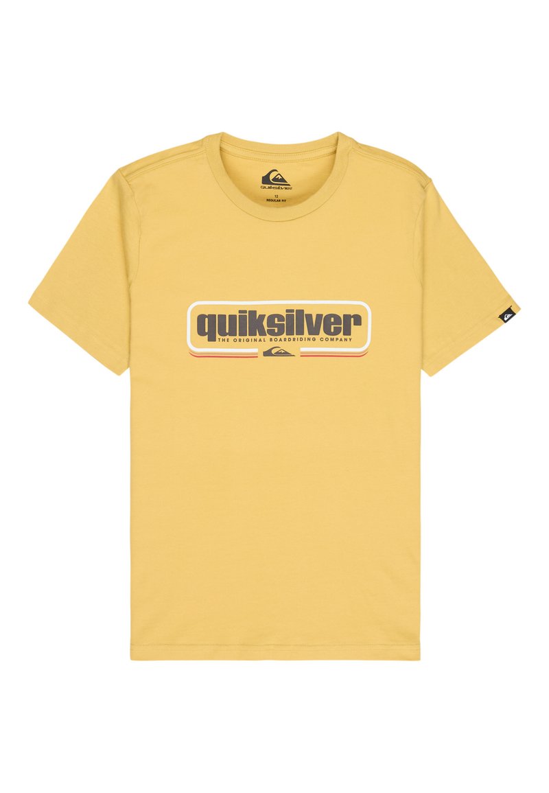 T-shirt jaune à manches courtes avec le logo "quiksilver" et le texte "The Original Boardriding Company" centrés sur le devant.