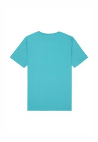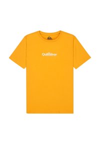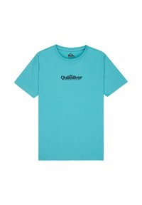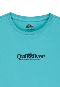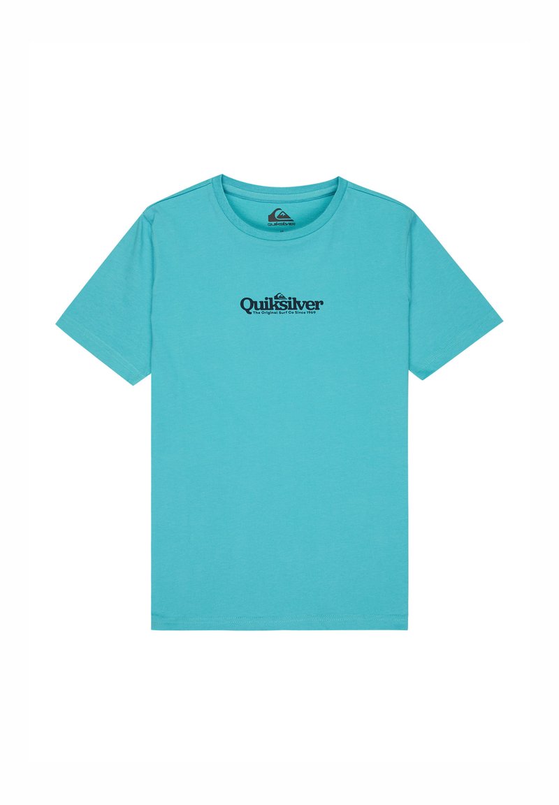 T-shirt Quiksilver turquoise à manches courtes avec encolure ronde et texte du logo noir centré sur la poitrine.