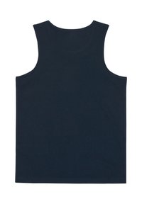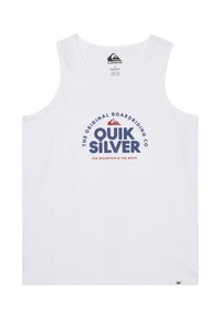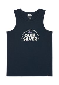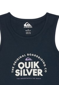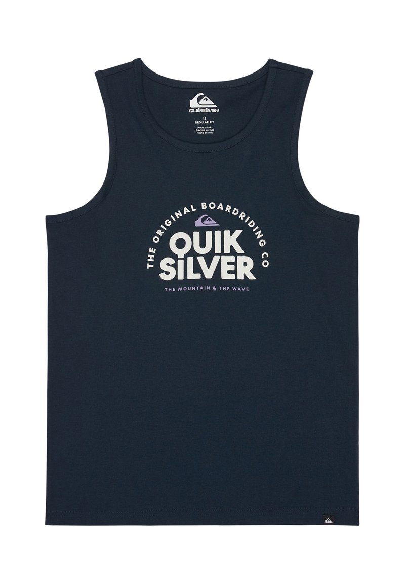Débardeur bleu marine sans manches avec le logo "Quiksilver" et le texte "The Original Boardriding Co" ainsi que "The Mountain & The Wave" sur le devant.