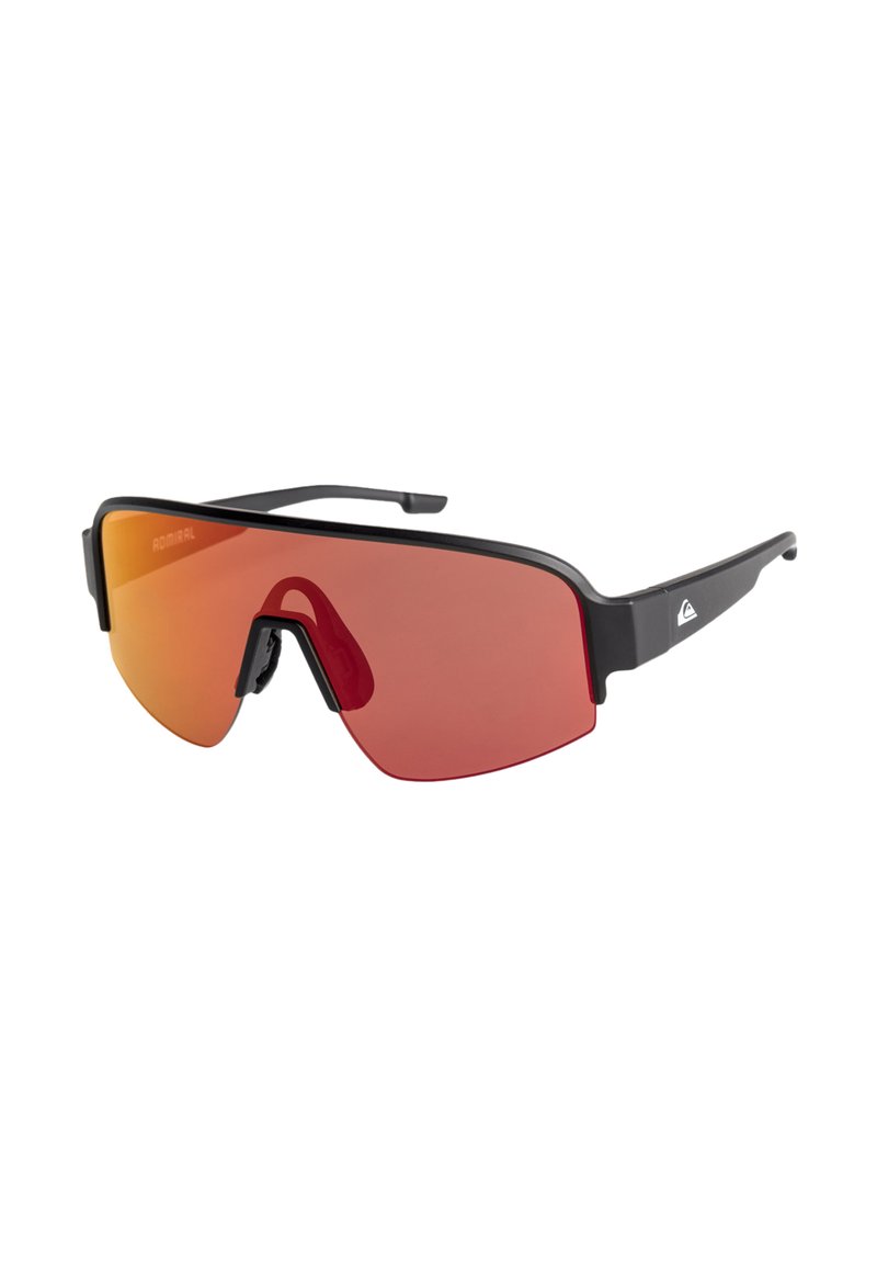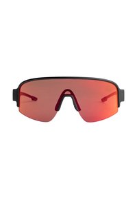 Lunettes de sport noires avec une lentille rouge-orange monobloc, dotées d'une monture légère et d'un design minimaliste. Pas de logos visibles.
