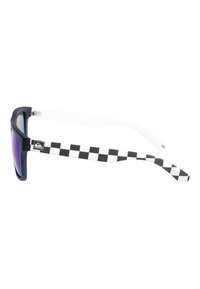 Lunettes de soleil rectangulaires à miroir bleu avec une monture avant noire et des branches à carreaux blancs comportant un petit logo sur la branche.