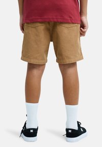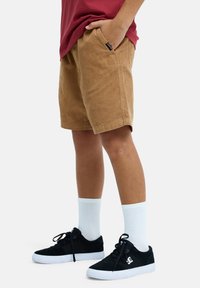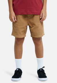 Enfant portant un short en velours côtelé marron, des chaussettes blanches montantes, des baskets noires et un t-shirt rouge, mains détendues le long du corps.