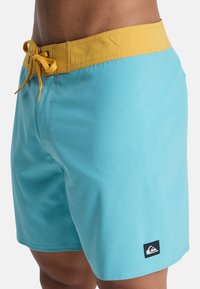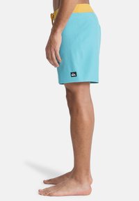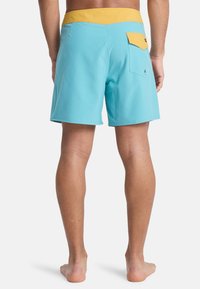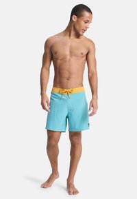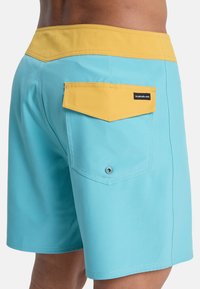 Homme portant un short de bain turquoise avec une ceinture jaune et un cordon, debout pieds nus devant un fond uni.