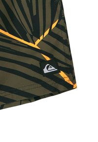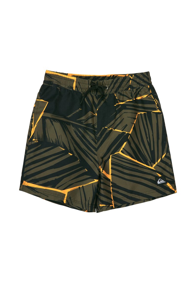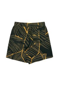 Shorts de bain pour hommes avec des motifs abstraits de feuilles en noir et vert olive, avec des accents orange, dotés d'une taille élastique et d'un cordon de serrage.