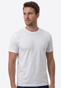 Homme aux cheveux courts et bruns portant un t-shirt blanc uni à manches courtes, regardant légèrement vers la gauche, sur un fond clair.