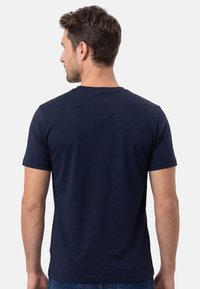 Homme aux cheveux bruns courts portant un T-shirt bleu marine ajusté à encolure en V et un jean bleu, regardant légèrement sur le côté.