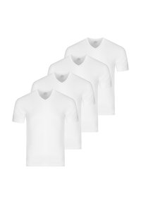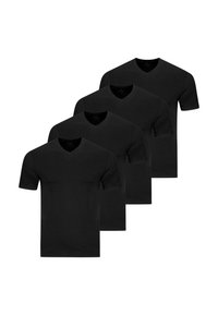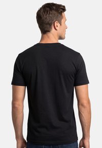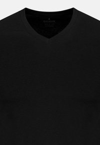 Jeune homme aux cheveux bruns courts portant un T-shirt noir uni à col en V, regardant vers sa gauche avec une main dans la poche de son jean.