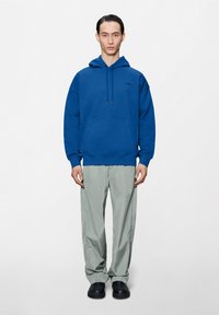 Homme debout portant un sweat à capuche bleu, un pantalon ample gris clair et des chaussures noires sans lacets, devant un fond blanc uni.