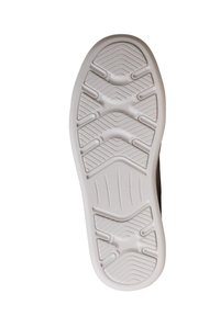 Baskets décontractées beige avec semelle blanche, panneau latéral en mesh, patch de talon marron, doublure intérieure bleue et lacets sur fond blanc.