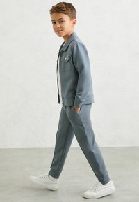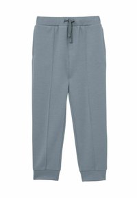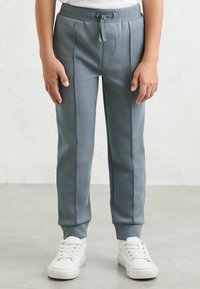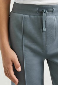 Pantalon de survêtement gris clair avec taille à cordon, jambes fuselées, poches latérales et texture subtile pour le confort.
