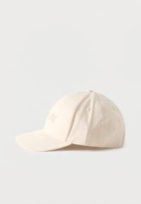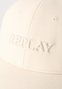 Casquette de baseball beige clair avec visière courbée et texte brodé "REPLAY" au centre avant, présentée sur un fond blanc uni.